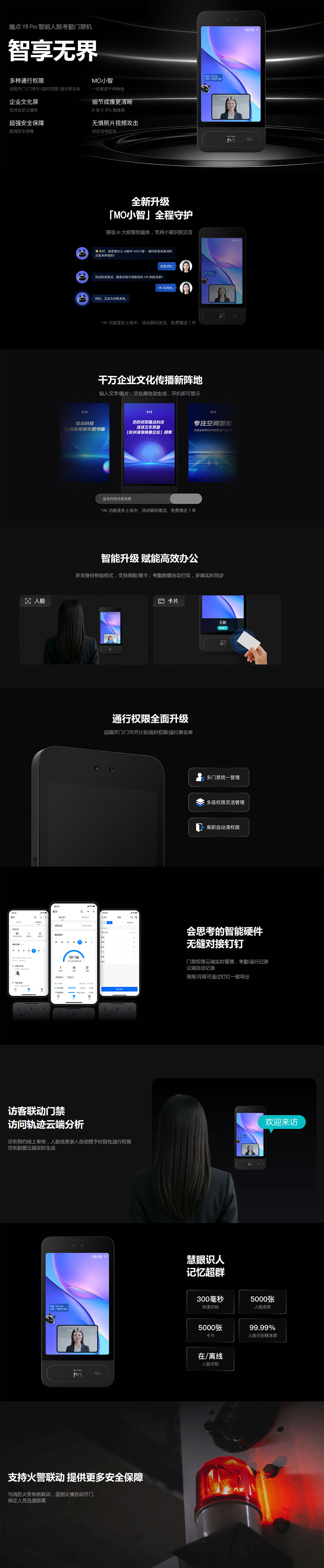 魔点Y8 Pro智能人脸考勤门禁机核心功能:多种通行模式:远程开门/门常开/临时权限/黑名单管理安全识别:双目活体……